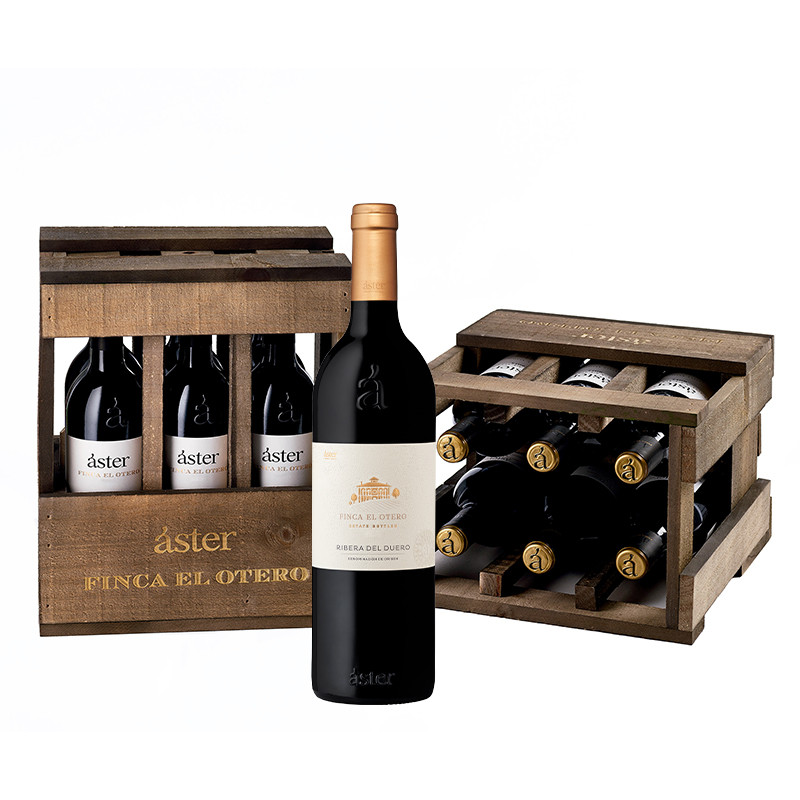Caja de madera con 6 botellas de 75 cl. de Áster Finca el Otero, un Ribera del Duero clásico y enérgico, poderoso pero bien educado. Complejo pero entendible. Intenso y cremoso con frutas negras y taninos domados.